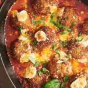 For chicken parm meatballs, you’ll quickly mix ground chicken thighs with some of the breadcrumbs and cheese, herbs and garlic roll them around in some more of each. Then you’ll fry quick fry them and let them finish baking in the oven.