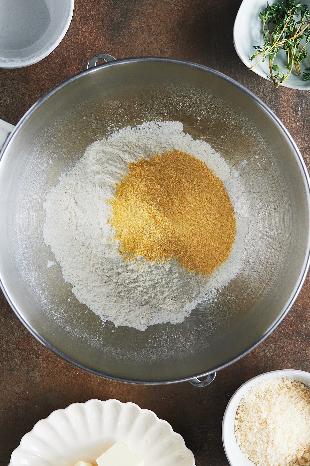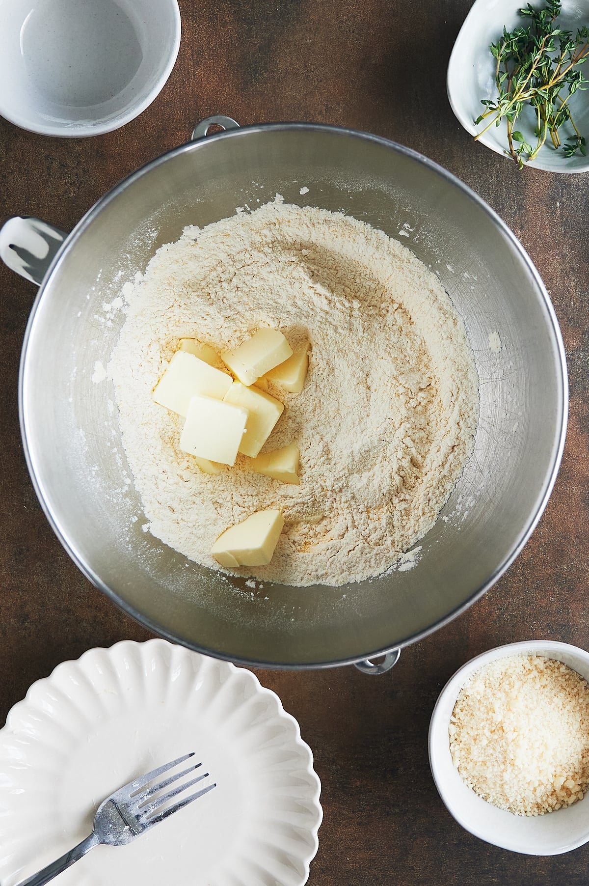 - Combine flour and cornmeal. stir in salt. add butter with mixer until coarse crumbs form. Add 1 Tablespooon water until dough forms and comes together. Add in thyme ,parmesan cheese and cayenne plus more water as needed.