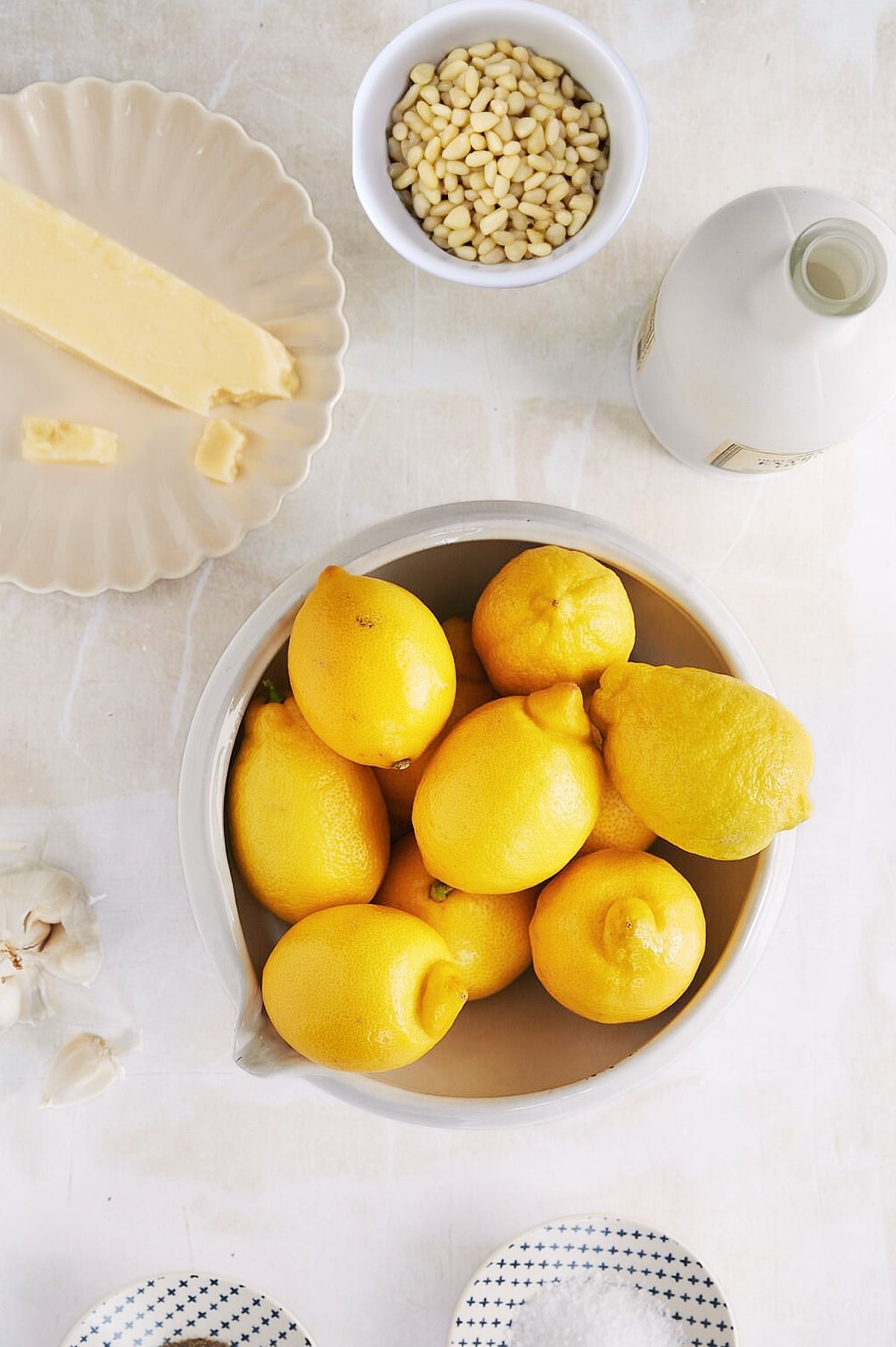 Regardless, I use the same supporting cast of ingredients for pesto with lemon as I did in basil pesto except the quantities have been adjusted to balance the lemon.