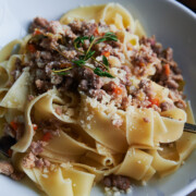I have to admit that when I first conceptualized this twist on a classic Bolognese recipe, I wasn’t prepared to like it so much. Scratch that…love it so much. Since my red Bolognese recipe has become one of my all-time favorite pasta sauces, I couldn’t imagine a simple white Bolognese with chicken passing it up.