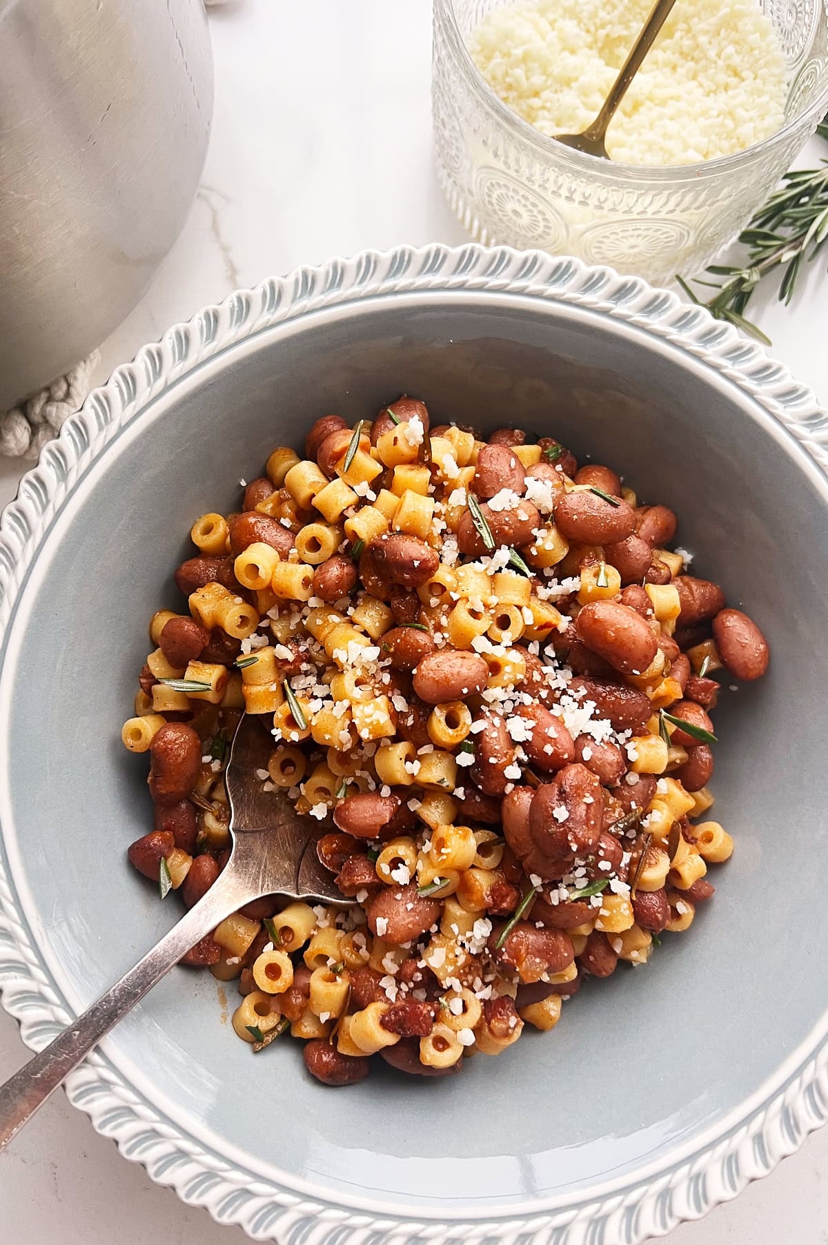 - Once the beans are tender and have absorbed the broth (hopefully), stir in the cooked pasta, the minced rosemary and finally the butter until melted. Correct for seasoning and serve with grated Parmesan cheese and a drizzle of olive oil.1 ½ cups ditalini pasta, 1 T unsalted butter, parmesan cheese, drizzle of olive oil