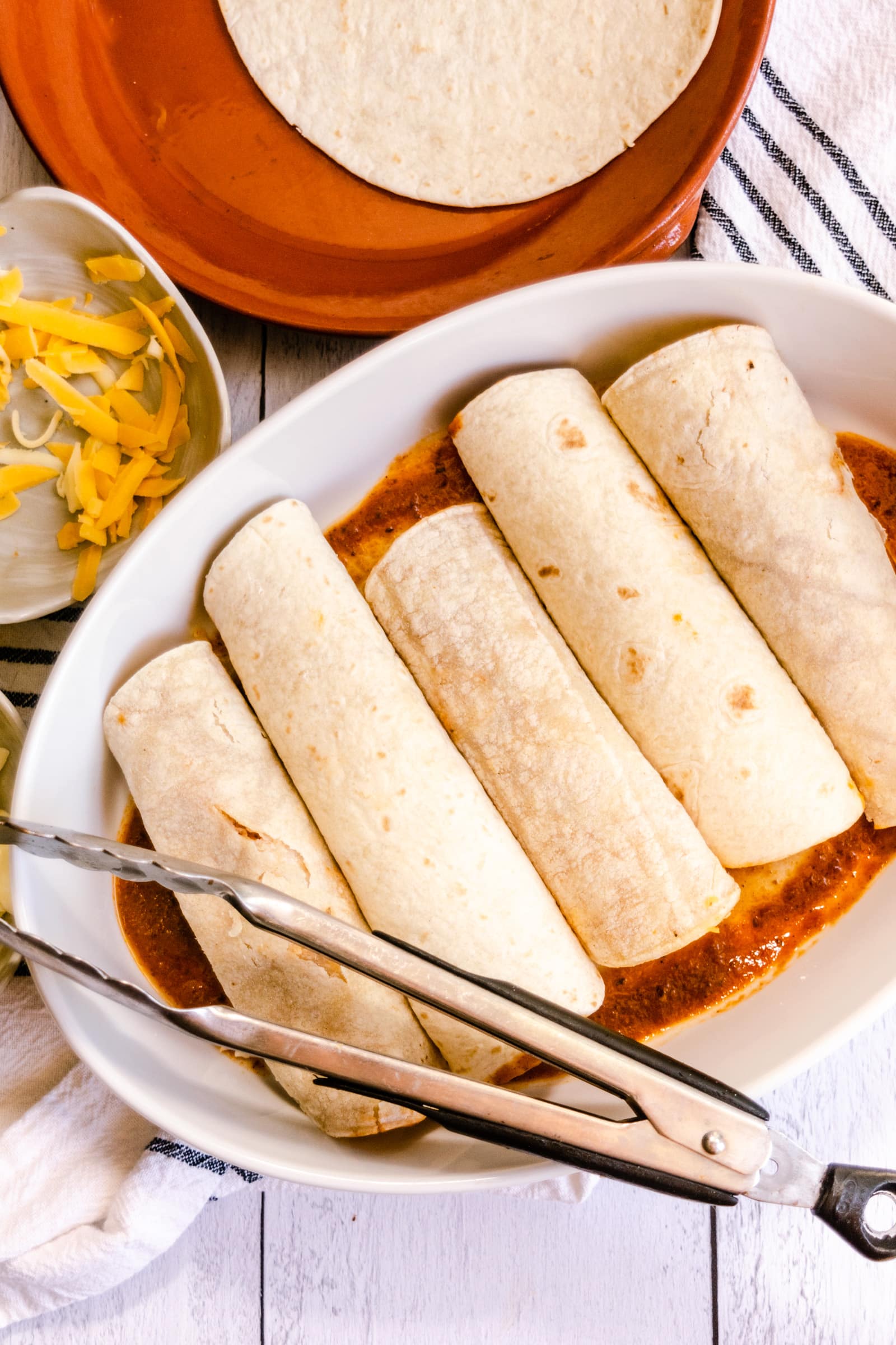 - Using tongs, dip a tortilla into the sauce to coat one side. Flip over and coat the other side. Allow the excess to drip off. Place on a work surface or plate.